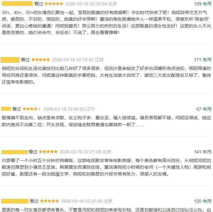 最扎心的还是她对儿女那套“重男轻女”的逻辑。下班回家先瞅儿子,舍不得给女儿买新校服,却肯给儿子买贵价百科全书;吃面时那点肉末全夹给儿子,干活的女儿反倒没份。可当你看到她把肉让给姐姐的儿子,或者给热得满头大汗的女儿扇扇子时,你又恨不起来。她爱钱、虚荣,甚至劝女儿放弃被抄袭作品的维权,觉得日子过得去就别争了。这种矛盾劲儿,恰恰是那个年代底层女性的真实写照。 比起剧中那个疯批又贵气的柏庶母亲,任美艳的“穷”早就渗进骨子里了。穿着花花绿绿的衣服,被夸好看就笑得露牙花子,连垃圾桶里的卫生纸都要翻出来省着用。闫妮这几年作品总带着温暖,《外婆的新世界》打破年龄焦虑,《小巷人家》满是从容,这次更是把人物的卑微与坚韧拿捏得死死的。