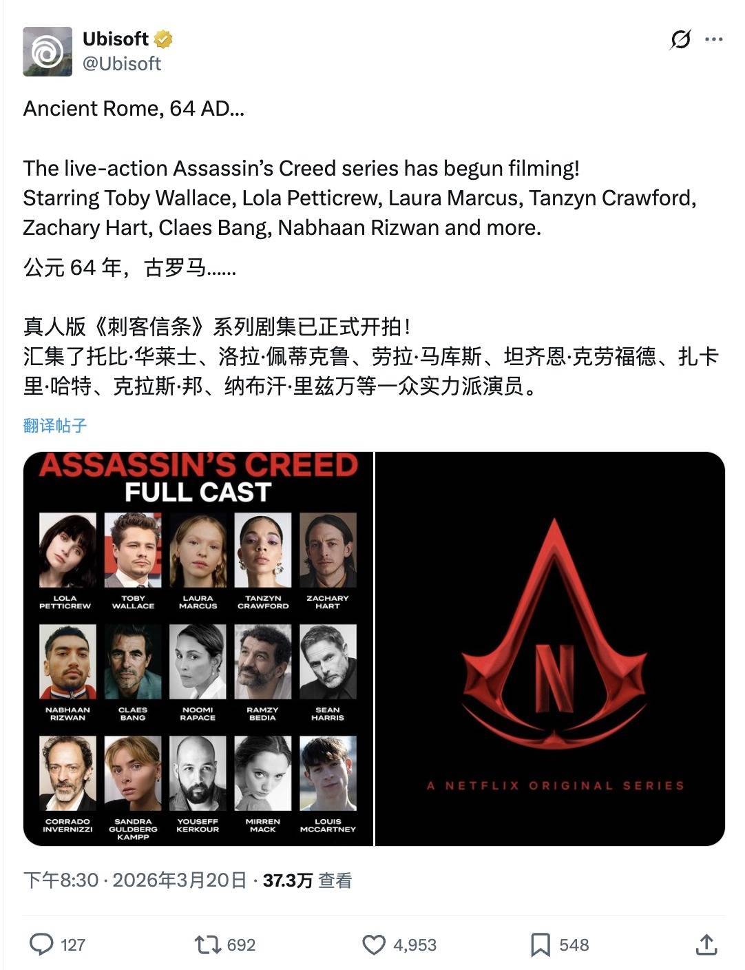 IT之家 3 月 20 日消息,育碧今天在 X 平台确认,《刺客信条》真人剧已经正式开拍,剧情设定在公元 64 年的古罗马。演员阵容同步公布,托比 · 华莱士与萝拉 · 佩蒂克鲁将担任主角。
