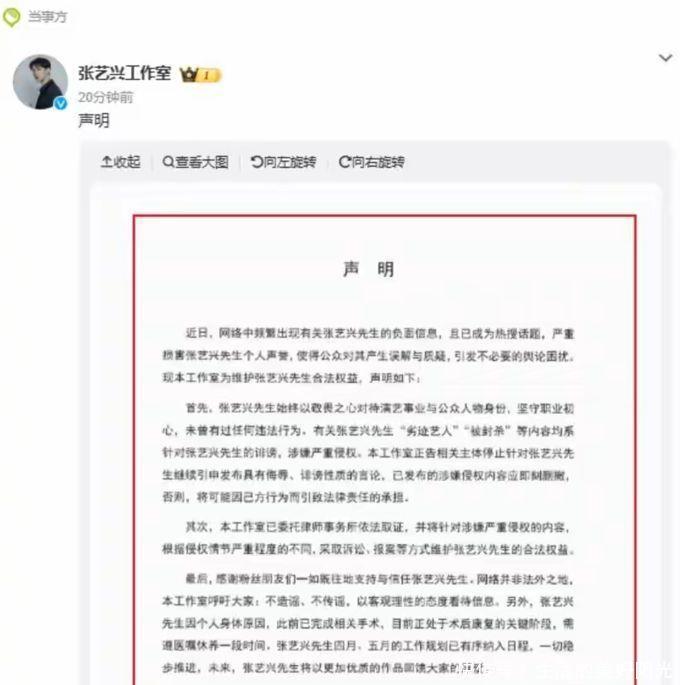 就在流言蜚语达到高潮,网上的每个人都在期待一个统一的解释时,张艺兴的工作室终于站出来为他发声。